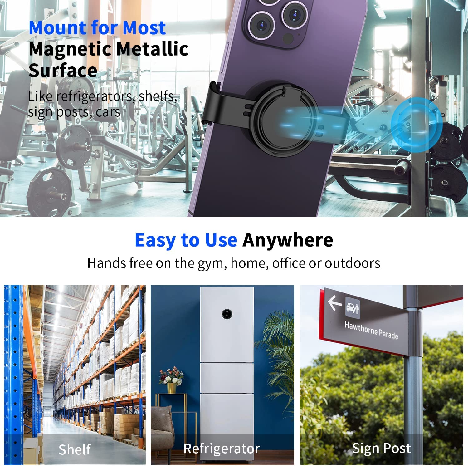 HANDS-FREE VIEWING - Use this magnetic phone clip to mount your phone directly adsorb on any metal objects like refrigerators, kitchen cabinets, gym equipment, trucks, etc. So you can view the phone hands free on the home, office, gym or outdoor!