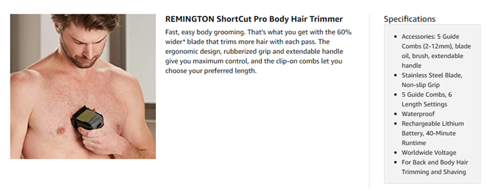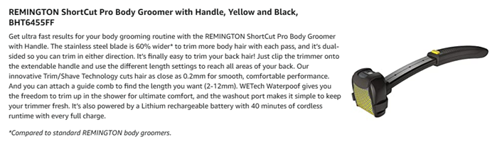Get ultra fast results for your body grooming routine with the REMINGTON ShortCut Pro Body Groomer with Handle. The stainless steel blade is 60% wider to trim more body hair with each pass, and it's dual-sided so you can trim in either direction. It's finally easy to trim your back hair! Just clip the trimmer onto the extendable handle and use the different length settings to reach all areas of your back. Our innovative Trim/Shave Technology cuts hair as close as 0.2mm for smooth, comfortable performance. And you can attach a guide comb to find the length you want (2-12mm). WETech 100% Waterpoof gives you the freedom to trim up in the shower for ultimate comfort, and the washout port makes it simple to keep your trimmer fresh. It's powered by a Lithium rechargeable battery with 40 minutes of cordless runtime with every full charge. It all adds up to efficient and comfortable body hair trimming. Compared to standard REMINGTON body groomers.