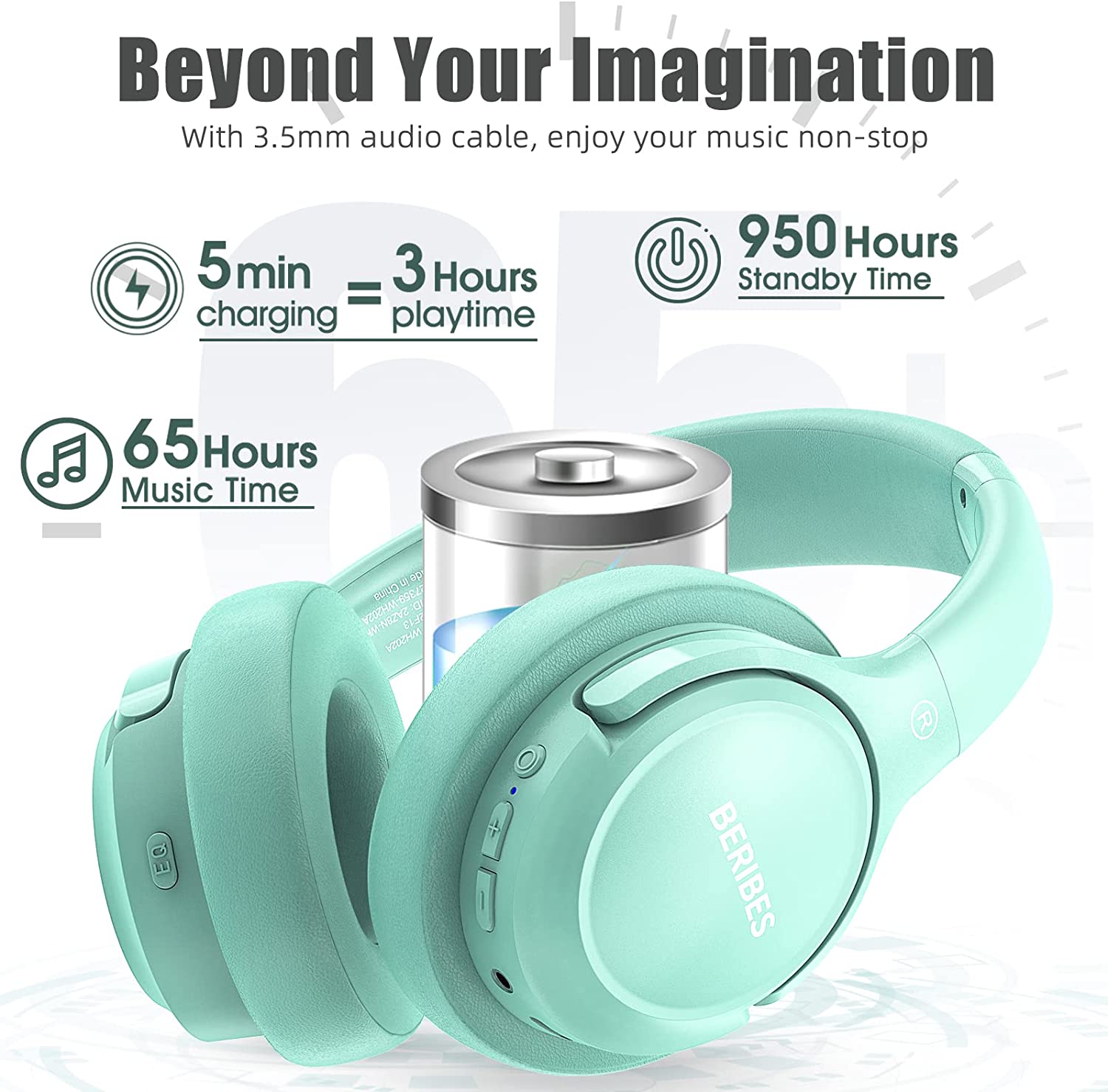 • ?【65 Hours Playtime】Low power consumption technology applied, BERIBES bluetooth headphones with built-in 500mAh battery can continually play more than 65 hours, standby more than 950 hours after one fully charge. By included 3.5mm audio cable, the wireless headphones over ear can be easily switched to wired mode when powers off. No power shortage problem anymore