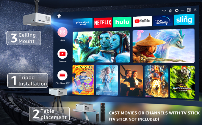 The projector with wifi and bluetooth supports 3 diffrent installation methods, from Table - Tripod - Ceilling. Recommended projection size is 40-120 inches with 360° inversion function, it can be projected from the front/back/ceiling.
