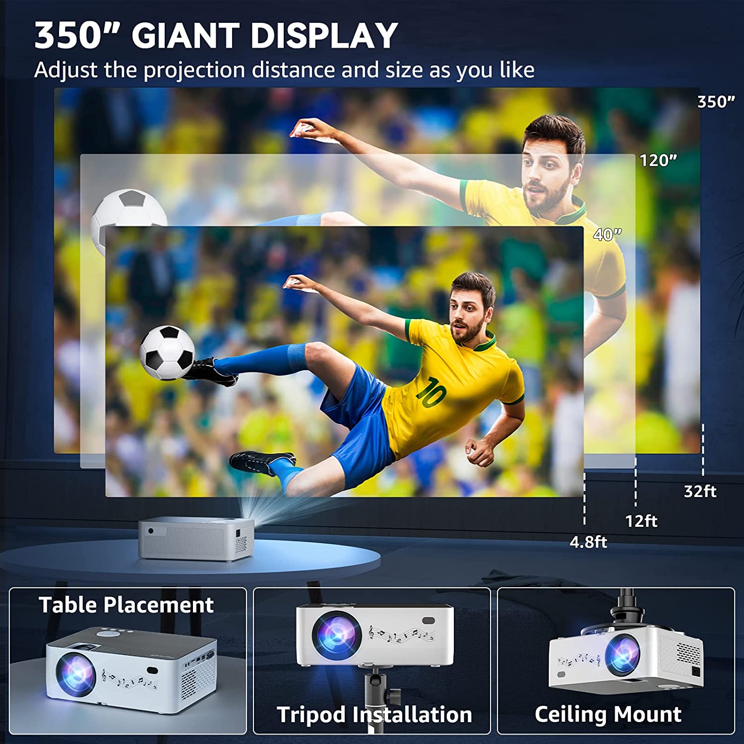 - Utral large 350'' Display - Feel like at a cinema and enjoy a visual feast with your famliy and friends!