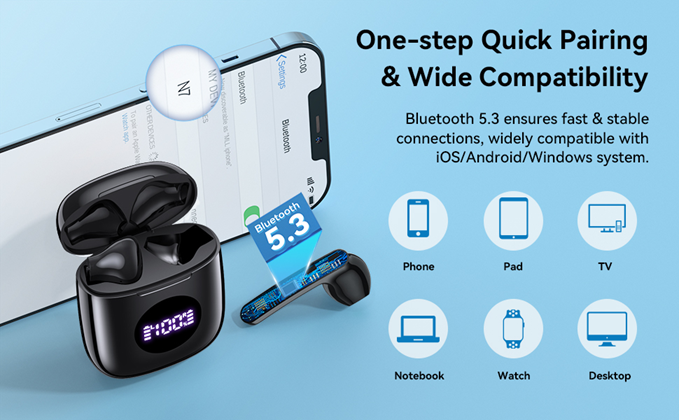 - 3.[Bluetooth 5.3 for auto quick pairing] Built in hall-effect switch, N7 wireless earphones achieve simple and high-speed automatic connection. After the first successful connection, just open the charging case lid, these wireless Bluetooth earbuds will automatically power on and connect with your phone. Bluetooth 5.3 ensures a fast & stable connection, sync audio and video without delay, widely compatible with iOS/Android/Windows system.