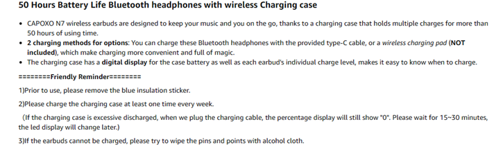 - 1.[Up to 50 Hours Playback with Wireless Charging Case] On single charge, CAPOXO N7 wireless earbuds last around 8 hours (at 50%-60% volume). With recharges provided by its compact charging dock, you can use them non stop for 50 hours. And the charging box works for wireless and plug in charging, making charging more convenient. Also the Built-in Dual LED power display allows you to grasp the remaining power of the charging case and the charging status of the earbuds in real-time.