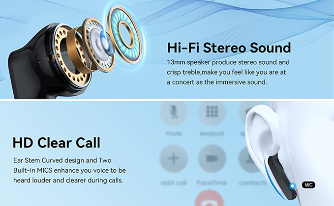 - 2.[Hi-Fi Clear Music & Talk] Engineered with 13-mm speaker driver, these Bluetooth headphones keep the sound crisp with deep bass, deliver an immersive sound experience. The curved design of the ear stem makes the built-in microphone closer to your mouth(to collect your voice effectively), which enhance phone calls performance greatly, let the other end can hear you clearly. Best choice for relaxing and business.