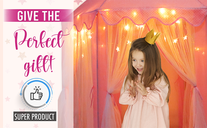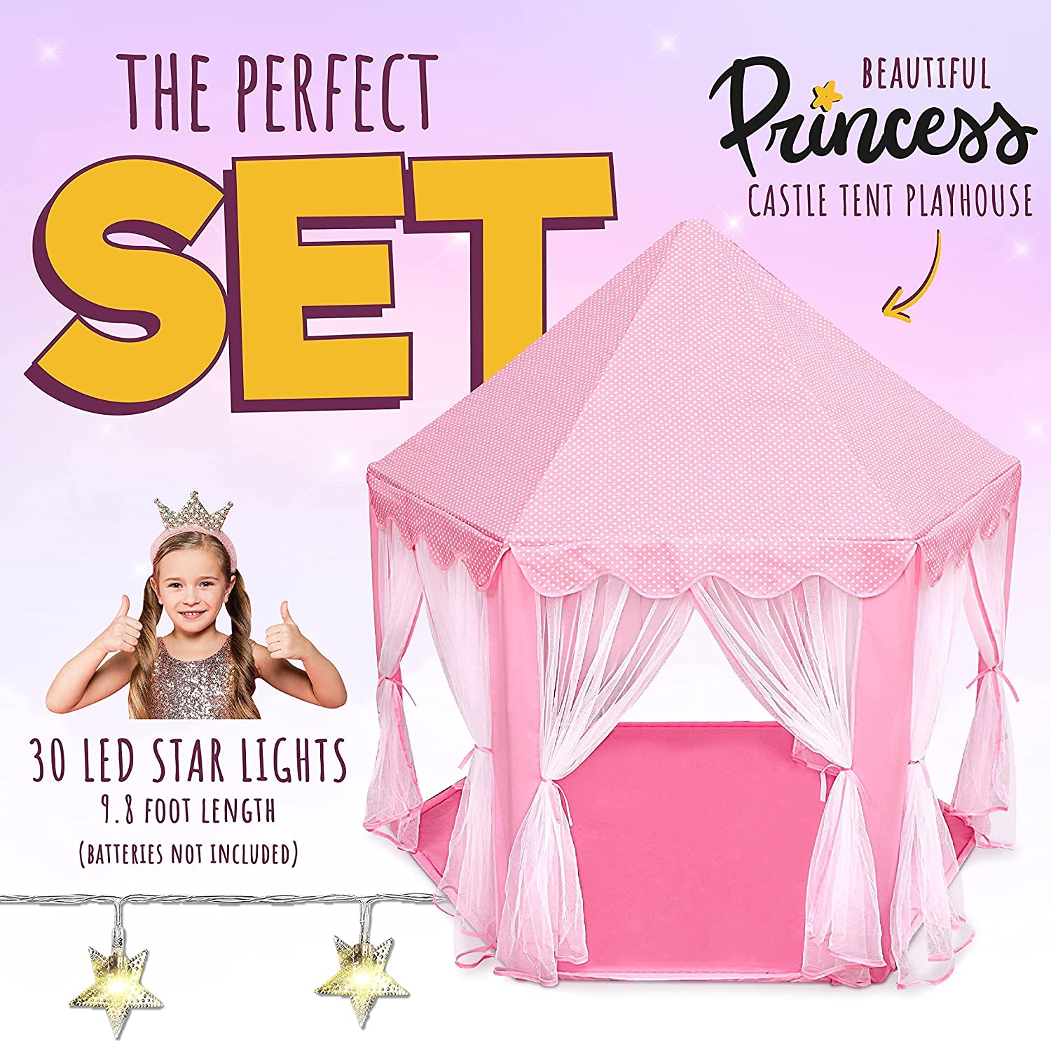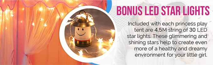 • BONUS LED STAR LIGHTS – Included with each princess play tent are an FCC certified 4.5M string of beautiful LED star lights (3 AA batteries not included). These glimmering and shining stars help to create even more of a healthy and dreamy environment and make the Perfect Princess Tent for Girls!