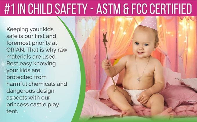 • #1 IN CHILD SAFETY – ASTM & FCC CERTIFIED Keeping your kids safe is our first and foremost priority at ORIAN. That is why we designed our kids playhouse tent by the strike standards of the American Society for Testing and Materials, which helps to ensure that only quality, raw materials are used. Rest easy knowing your kids are protected from harmful chemicals and dangerous designs aspects with our princess castle play tent.
