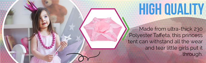 • HIGH QUALITY, DURABLE DESIGN – Made from ultra-thick 230 Polyester Taffeta, this princess tent for kids with lights can withstand all the wear and tear little girls put it through. This material is compatible for both indoor playhouse and kids outdoor playhouse, and will last for years of fun and enjoyment!