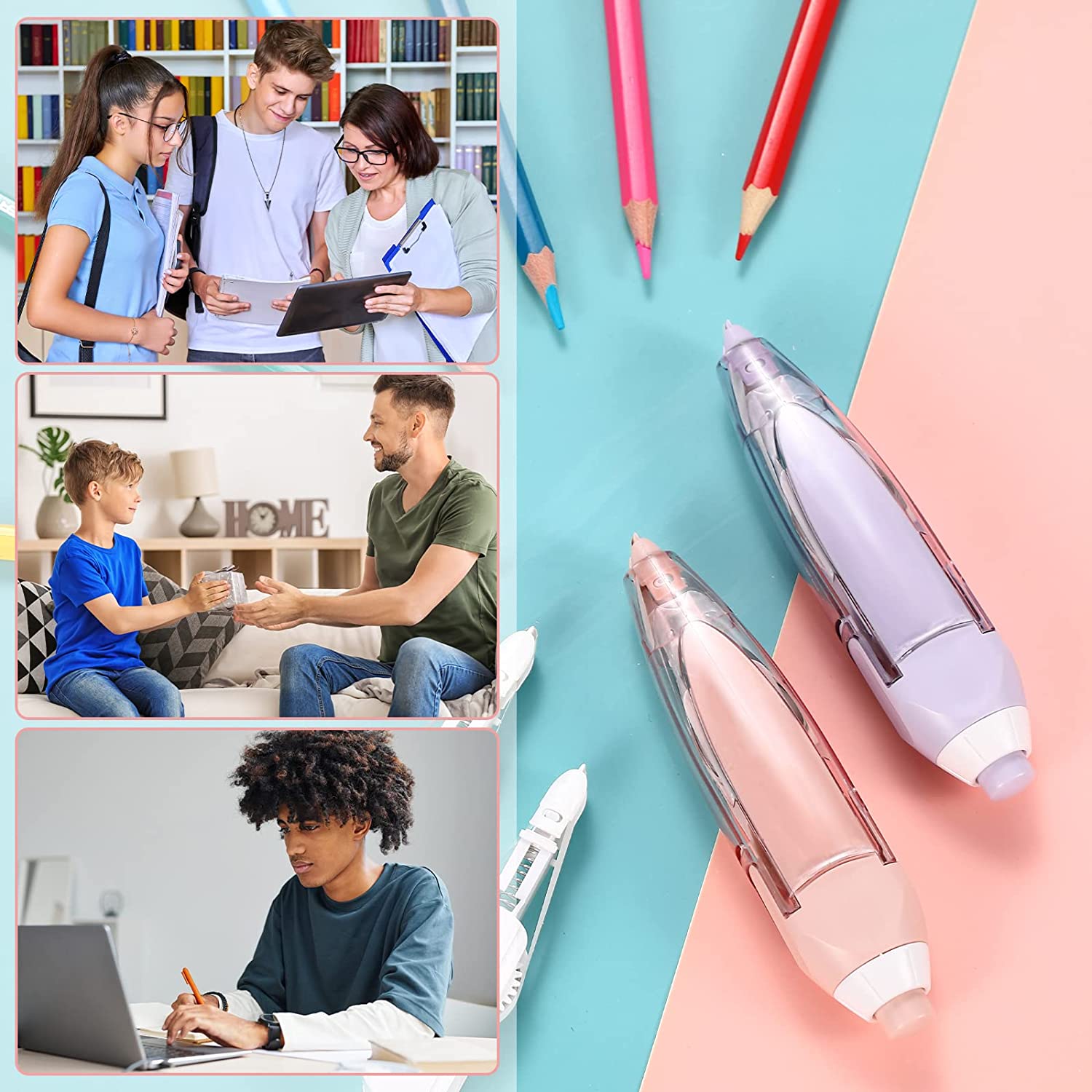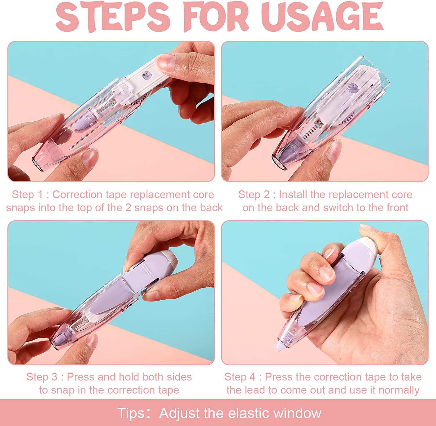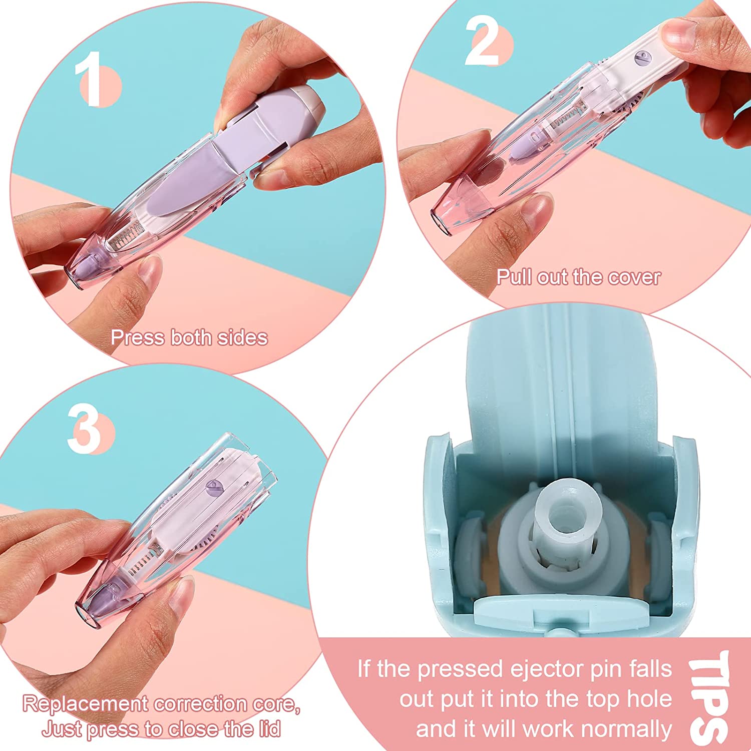 - Retractable and Flexible: the correction tape pen is designed with retractable function, easy to use and keeps pencil case clean; With replacement tapes, easy to replace, press the both sides to remove the cover, take out the replacement tape, install it back and put on the cover