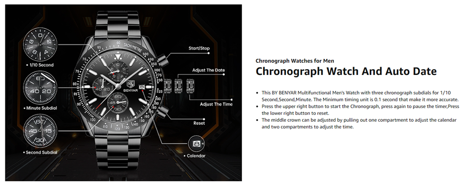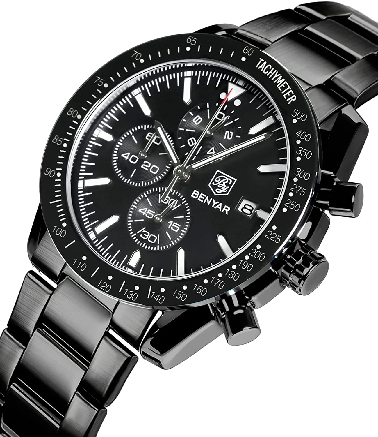 - ⌚ ELEGANT DESIGN: BY BENYAR offers a wide range of stylish luxury wrist watches specially crafted for men. The watch comes with 100% strong glass, black dial and tachymeter topring. The genuine stainless steel band with width 2.2cm and length 22cm give the watch a classy look. It is a multi-function chronograph with three sub-dial for second, minute and hour.