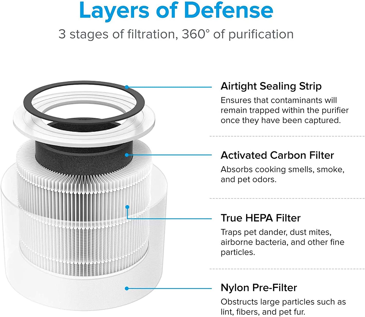 - FIND RELIF: Ease sneezing, congestion, and other allergy symptoms caused by airborne contaminants. The H13 True HEPA Filter works alongside the Pre-Filter and High-Efficiency Activated Carbon Filter to capture 99.97% of airborne particles 0.3 microns in size, such as dust, smoke, pollen, odor
