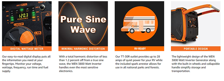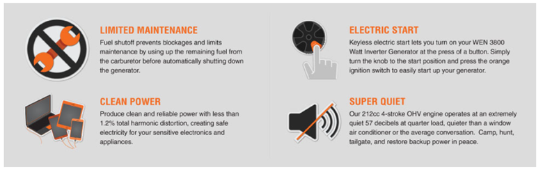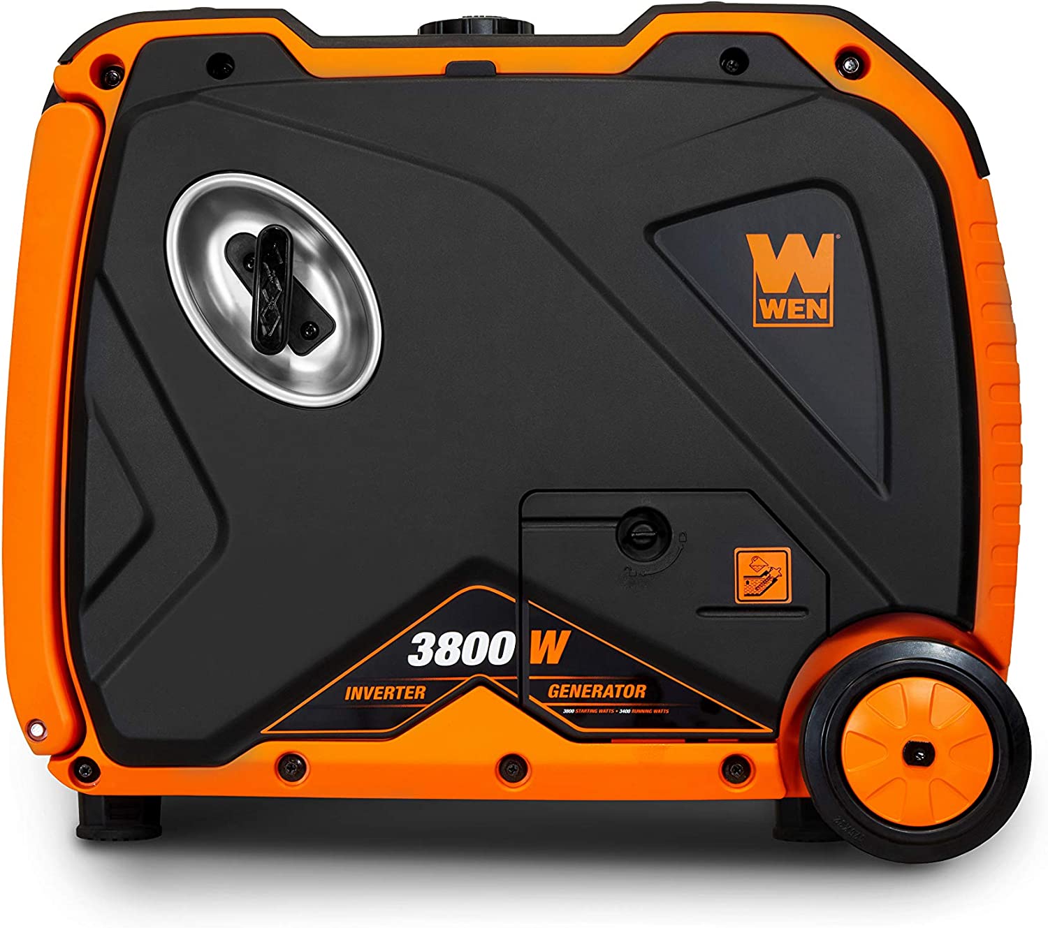 Remember when you had clean and quiet portable power? The WEN 3,800 Watt Inverter Generator produces clean energy free of voltage spikes and drops without making all of the noise of a regular generator. Generate up to 3800 surge watts and 3400 rated watts of power. Our 212cc 4-stroke air-cooled OHV engine operates at an extremely quiet 57 decibels at quarter load, about as quiet as a window air conditioner or the average conversation. This limits its invasiveness while hunting, camping, tailgating and restoring back-up power. The WEN 3800W Inverter Generator is also equipped with fuel shutoff. This feature turns off the flow of fuel, allowing the generator to use up the remaining fuel from the carburetor before automatically shutting down. This helps fight the build-up and blockages caused by stagnant fuel inside of the carburetor, minimizing maintenance while prolonging the unit’s lifespan. Designed to mirror a pure sine wave, this generator limits total harmonic distortion to under 0.3 percent at no load and under 1.2 percent at full load, making it safe enough to run laptops, cellphones, monitors, tablets and other vulnerable electronics. The lightweight design along with the built-in wheels and folding handle make for easy portability while the ultra-efficient 2.2-gallon tank provides over 8.5 hours of half-load run time. Our fully-packed panel comes equipped with two 3-prong 120V standard household receptacles, one AC 120V 30A NEMA TT-30R receptacle, one 12V DC receptacle, two 5V USB ports and an easy-to-read digital fuel and load display. Maximize fuel economy by engaging the Eco-Mode switch. This feature allows the generator's engine to automatically adjust its fuel consumption as items are plugged into and unplugged from the panel, preventing the usage of unnecessary gasoline. The oil access cover makes for easy oil changes. Need more energy? Easily link up two WEN inverter generators using a WEN GNA50i 50-Amp 6000-Watt Parallel Connection Kit (sold separately) in order to share wattage between multiple units. Low-oil and low-fuel automatic shutdown, indication lights, and overload protection safeguard both your generator and your electronics from damage. The included spark arrestor allows for legal use in national parks and campgrounds. And because this is a WEN Product, your inverter generator comes backed by a 2-year warranty, a nationwide network of skilled service technicians and a friendly customer helpline. Remember when your generator powered your electronics safely and quietly? Remember WEN.