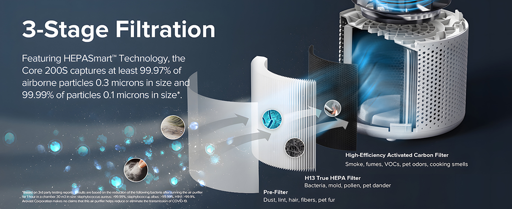 - IMPROVED FILTRATION: While the ultra-fine Nylon Pre-Filter and High-Efficiency Activated Carbon Filter capture large particles and absorb odors and fumes, the H13 True HEPA Filter captures 99.97% of airborne contaminants 0.3 microns in size, ridding your environment of dust, pollen, pet dander, mold spores, and more