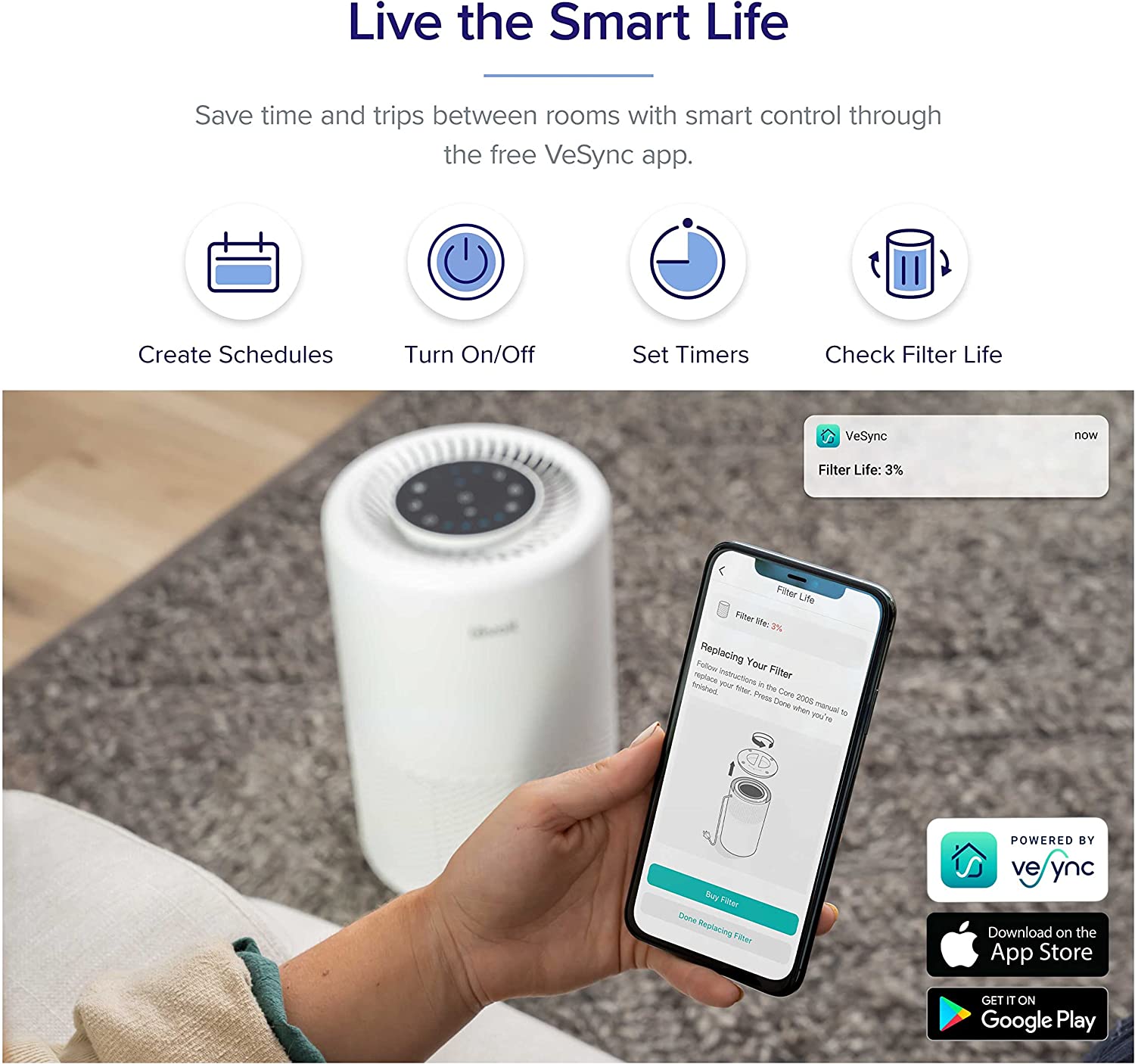 - ACCESS ANYWHERE: With the VeSync app, you can control your smart air purifier from anywhere. Adjust settings while you’re in the other room, at the office, or out walking the dog
