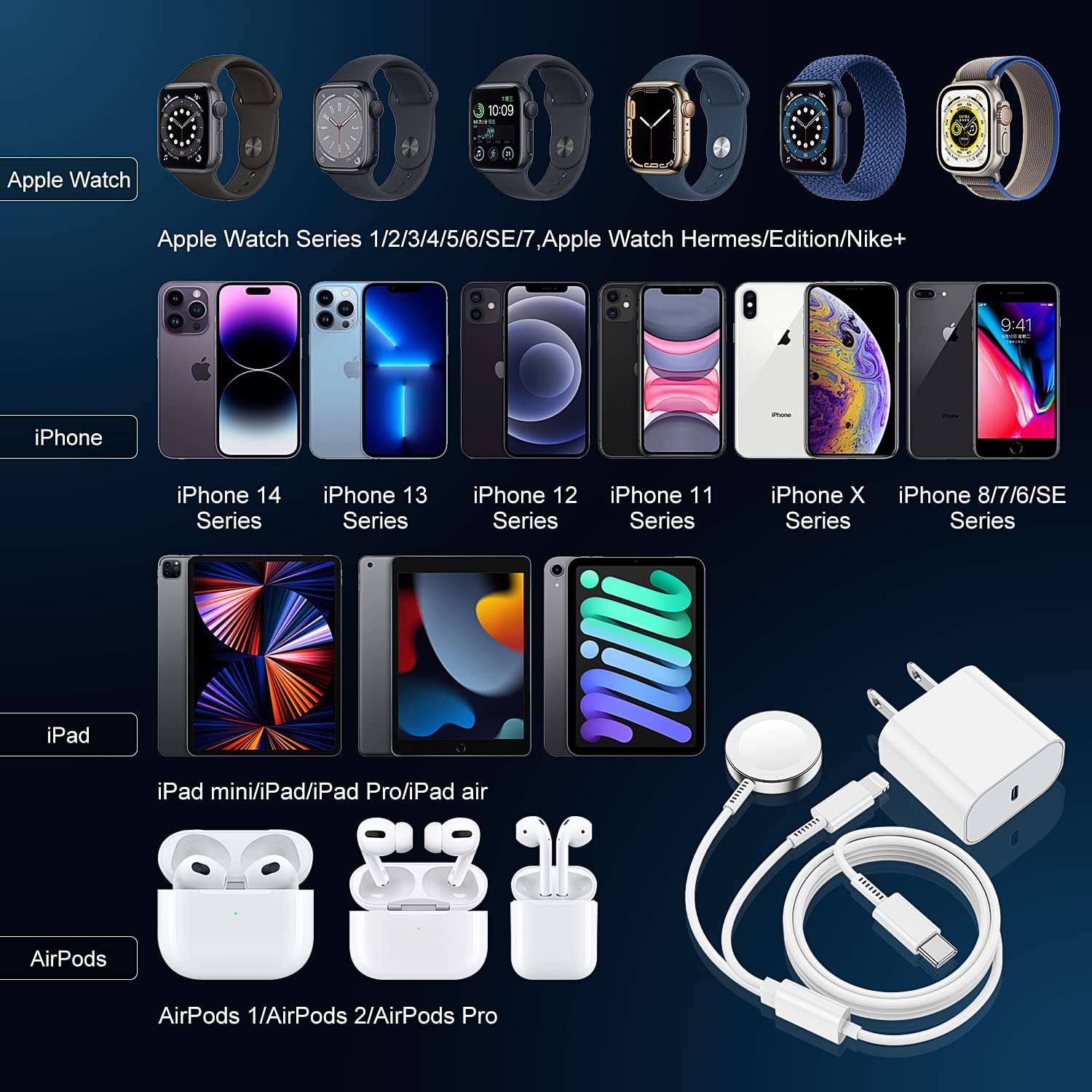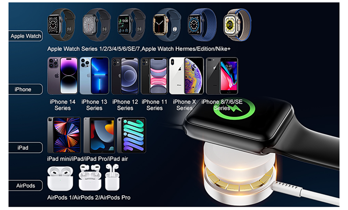 • [Broad Compatible with Apple Watch Charger]: Magnetic Fast Charging Cable is compatible with Apple Watch Series 8/7/6/SE/5/4/3/2/1 (including all 38mm, 40mm, 42mm, 44mm and 45mm) Apple Watch Sport/ Apple Watch Nike Plus/ Apple Watch Hermes/ Apple Watch Edition and iPhone Watch Charger is Compatible with iPhone 14 13 12 11 Pro Max XS XR X, iPad or Airpod series.
