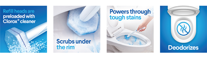 - DISINFECTING CLEANER: Preloaded with Clorox cleaner, these disposable scrubbing pads deep clean and remove stains while eliminating germs to make your toilet bowl feel like new.The Clorox ToiletWand System is safe for colored porcelain