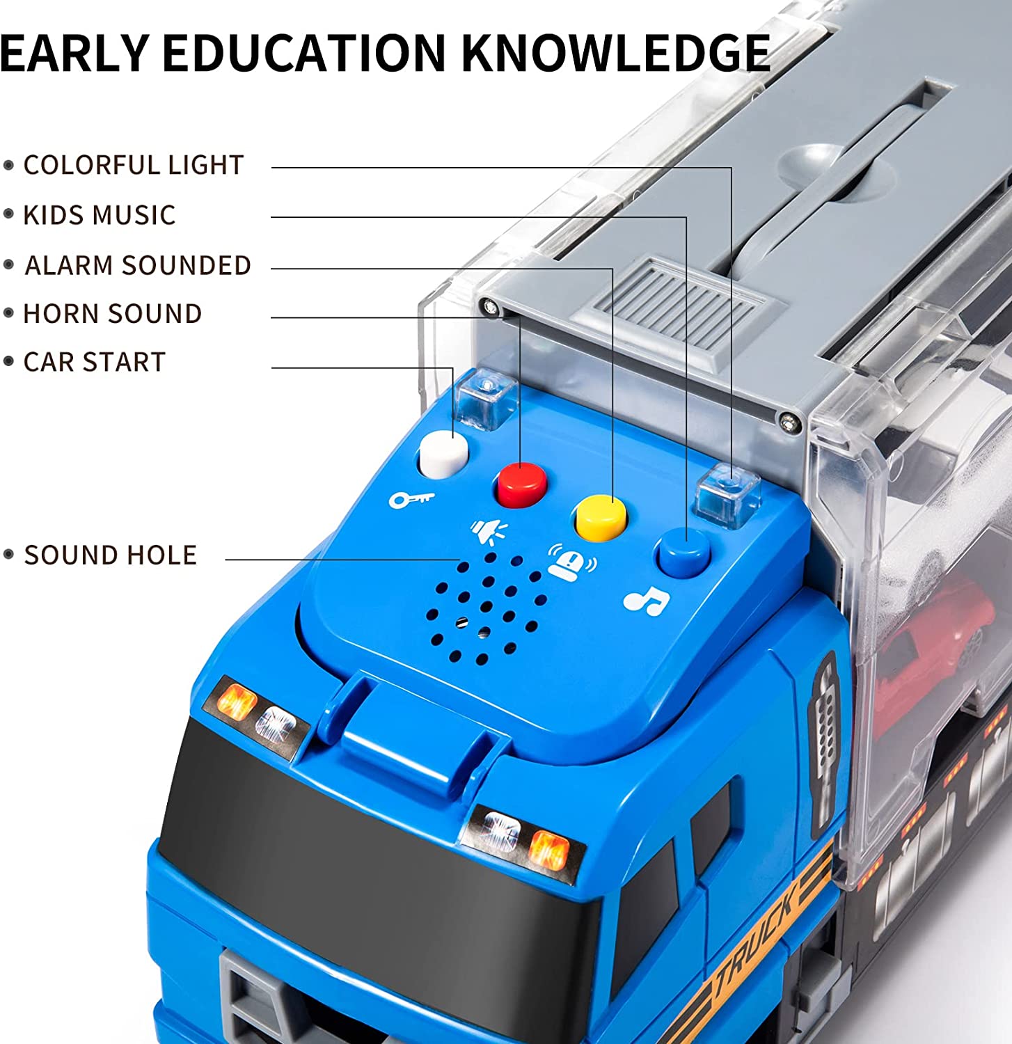Our multifunctional racing-themed toy truck has the function of early childhood education. Very suitable for parent-child educational toys. Through 6 small cars of different colors and a large truck with storage function, guide children's daily storage habits, cultivate children's language ability, hand-eye coordination ability, imagination development, logical thinking, etc.