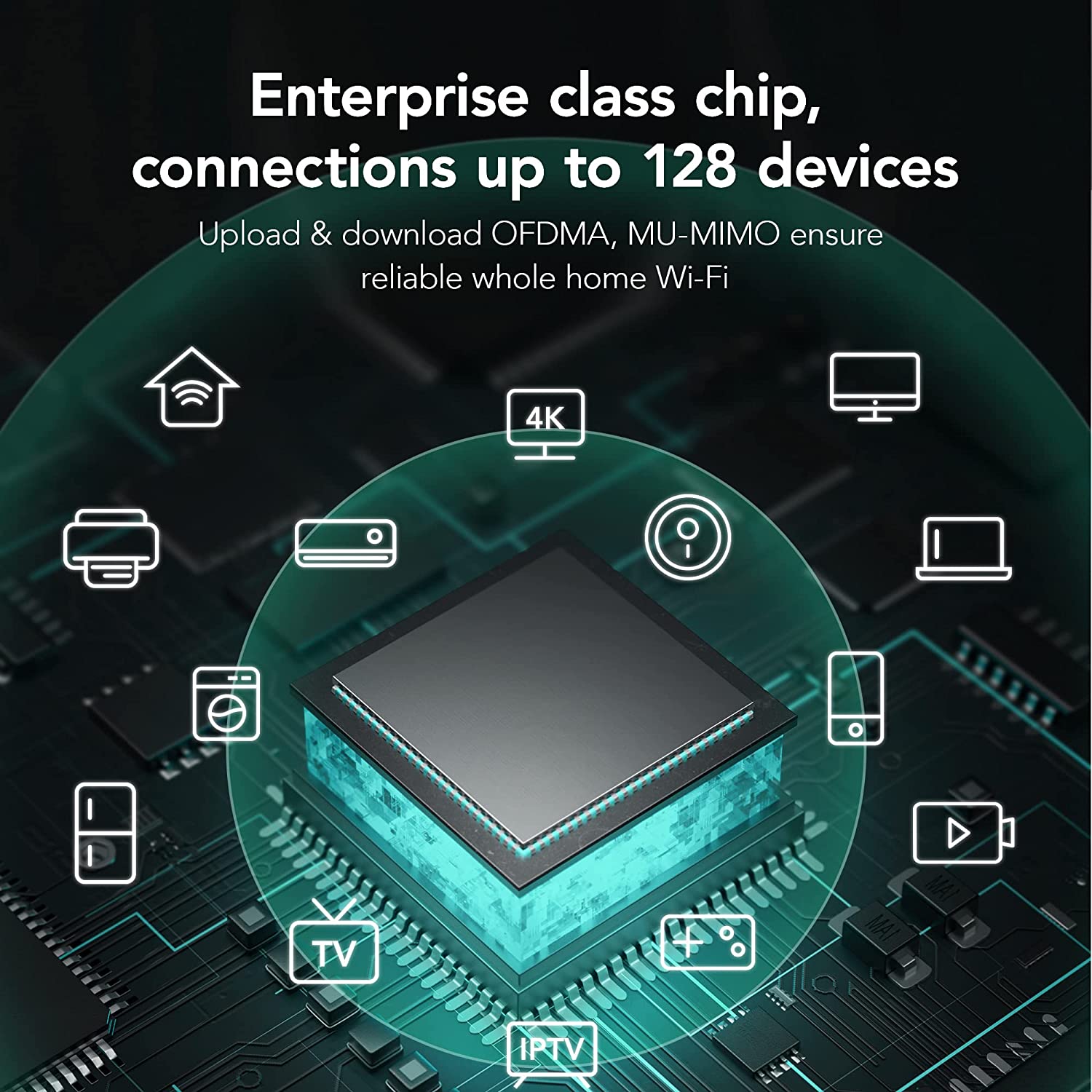 - Multi-user-friendly design: This Wi-Fi 6 Wireless Router supports the 802.11ax Wi-Fi standard, allowing many users to share channels and connect up to 128 devices, increasing network capacity and efficiency in congested areas. Easily address the party's multi-device dilemma.