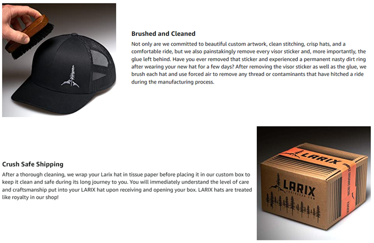 • SHIPPED IN BOX : After your hat has been cleaned and prepped we wrap your Larix hat in tissue paper before placing it in our custom box to keep it clean and safe during its long journey to you. IF YOUR HAT DOESN'T ARRIVE IN A BOX PLEASE REACH OUT TO US DIRECTLY TO LET US KNOW. You will immediately understand the level of care and craftsmanship put into your Larix hat upon receiving and opening your box.