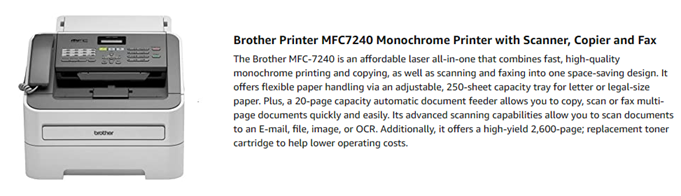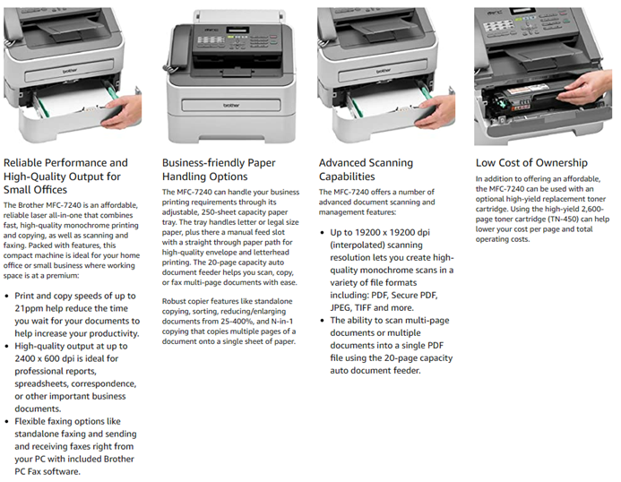 The MFC-7240 is an affordable laser all-in-one ideal for small offices or home offices. It combines high-quality monochrome printing and copying at up to 21ppm, as well as scanning and faxing into one space-saving design. Plus, it offers a large 250-sheet capacity paper tray for fewer refills.