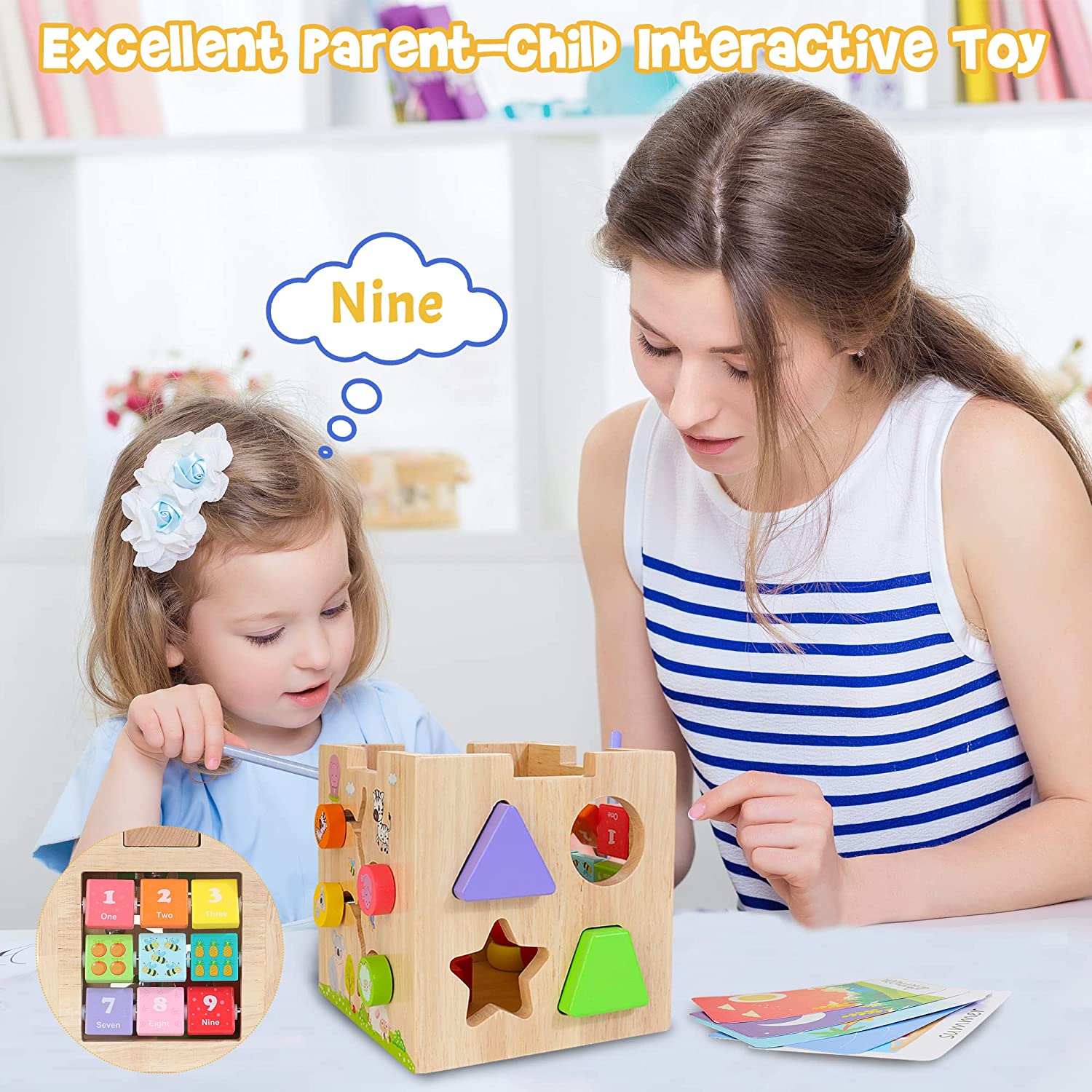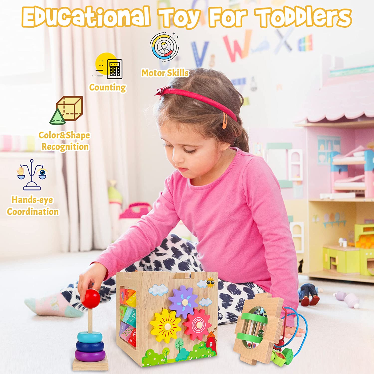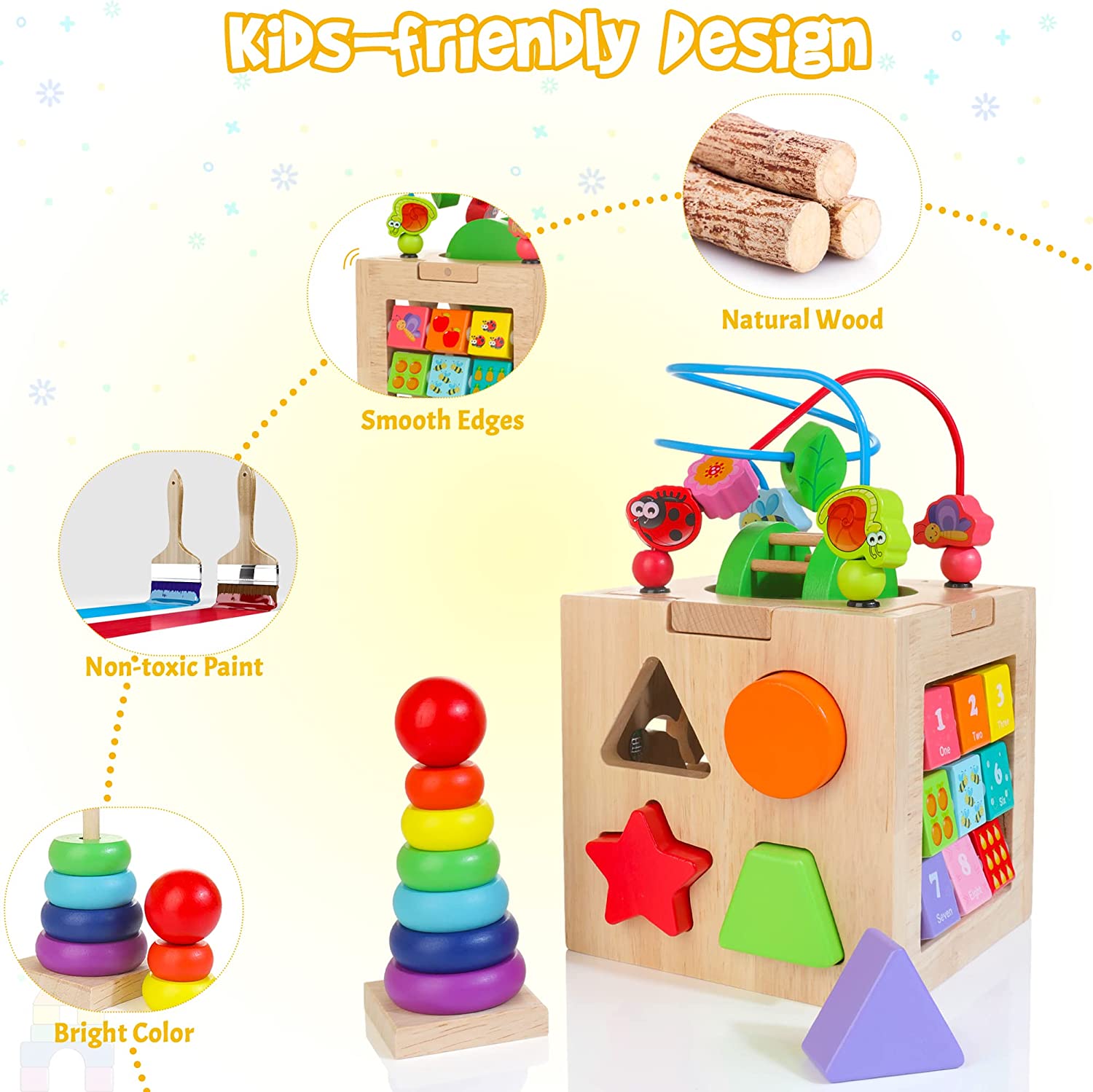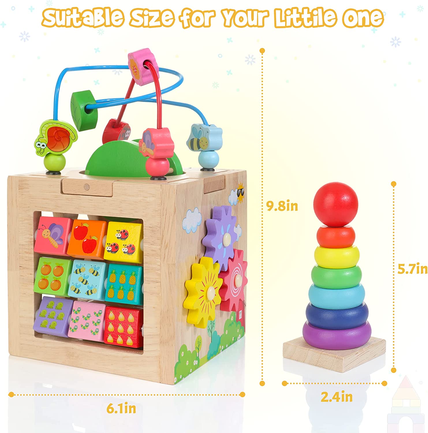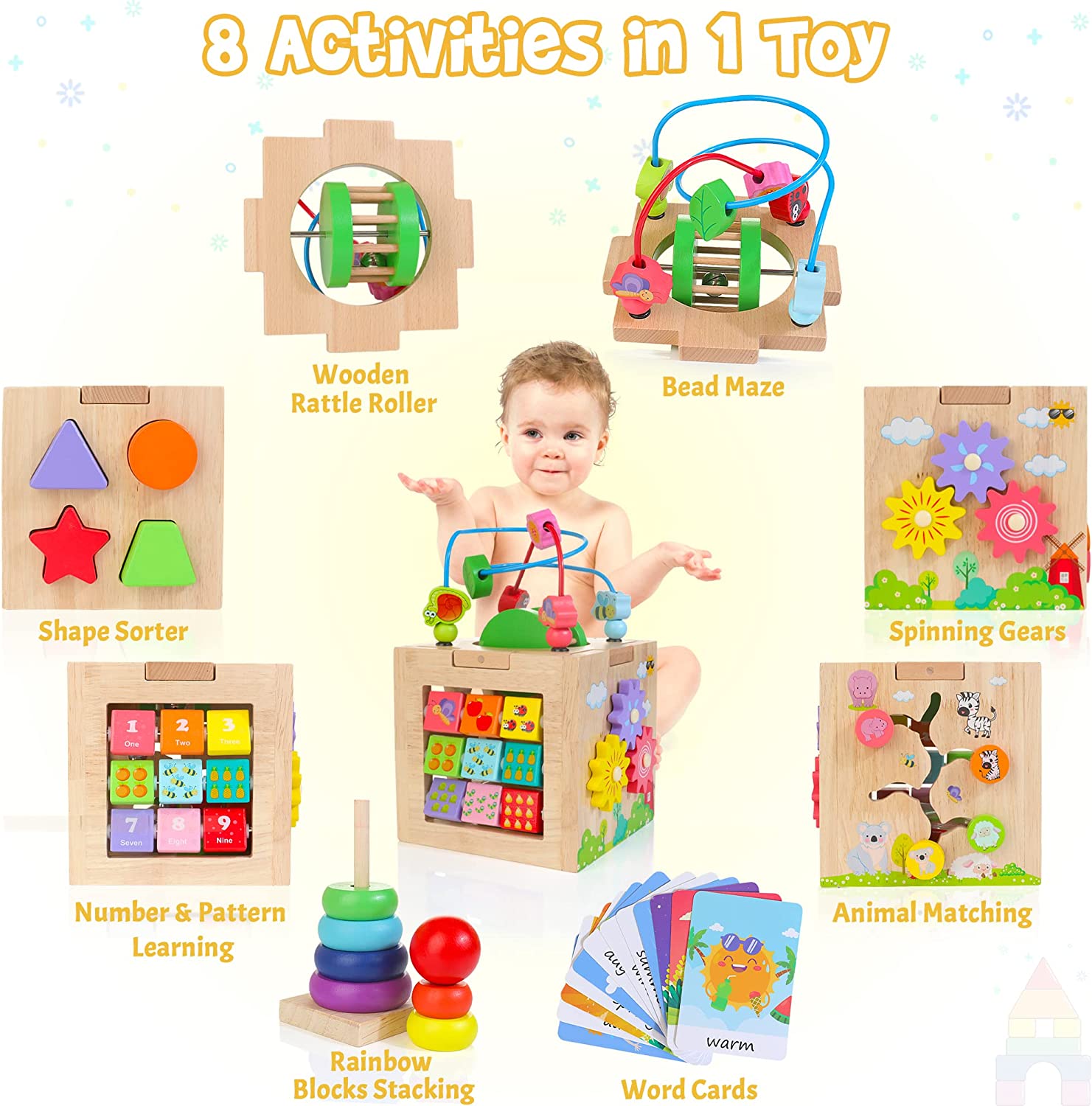 • 【8-in-1 Baby Activity Cube】We combine 8 activities in 1 toy: rainbow stacking rings, wooden rattle roller, number & pattern learning, bead maze, shape sorter, spinning gears, animal matching, word cards. Your child will be super immersed in it for hours to experience various fun