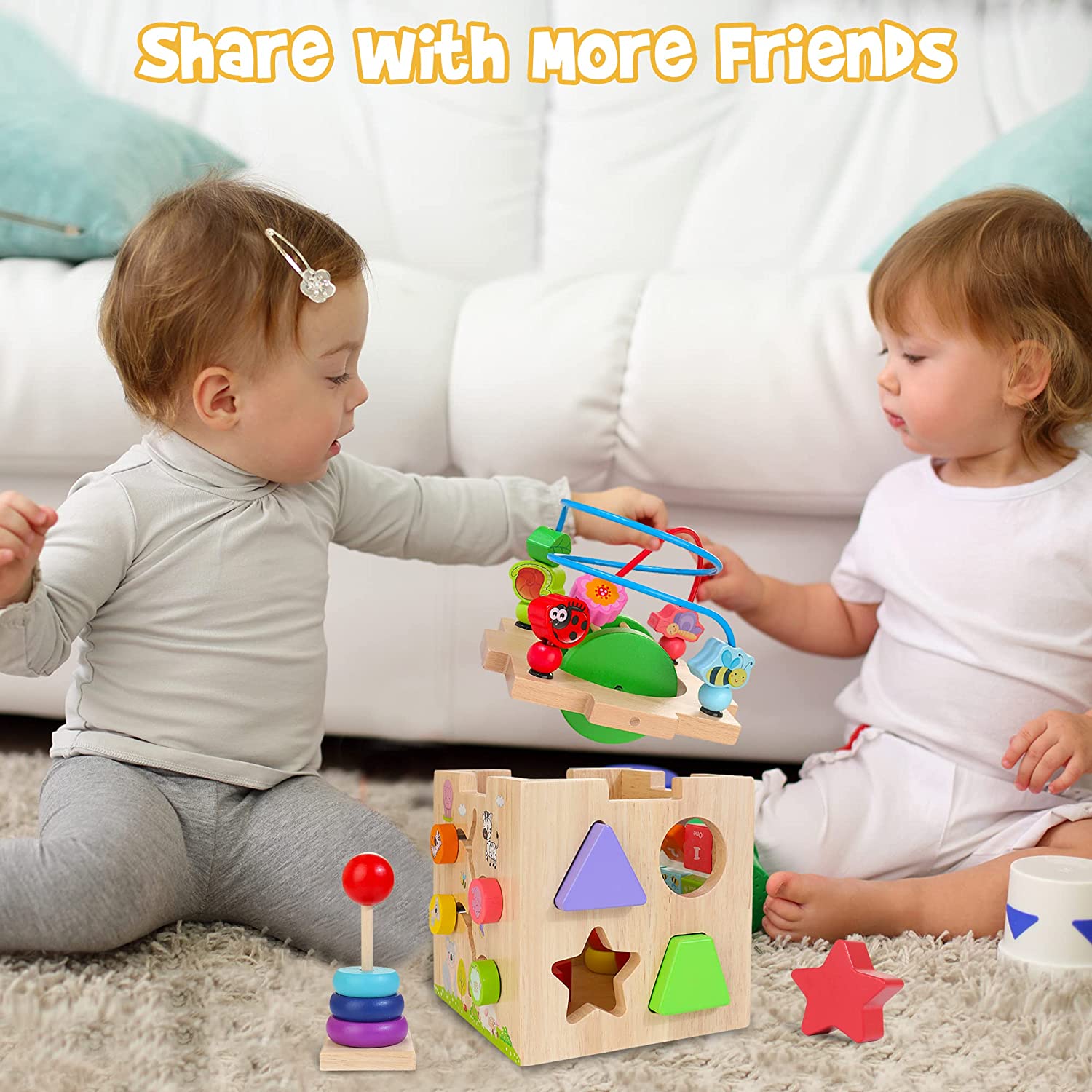 Kizfarm Wooden Activity Cube 1 Year Baby Toys, 8-in-1 Montessori Wooden Toys for 1 Year Old Boys Girls, Developmental Learning Sorting & Stacking Toy for Toddlers, 1st Birthday Gift
