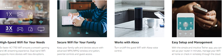 • Router for wireless internet, works with Alexa, compatible with all Wi-Fi devices, 802.11ac and older