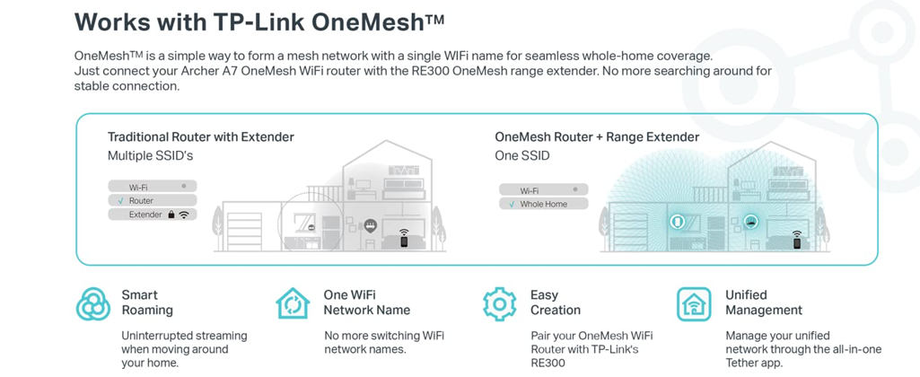 • OneMesh Compatible Router- Form a seamless WiFi when work with TP-Link OneMesh WiFi Extenders