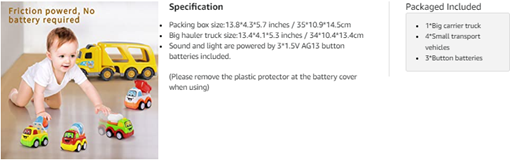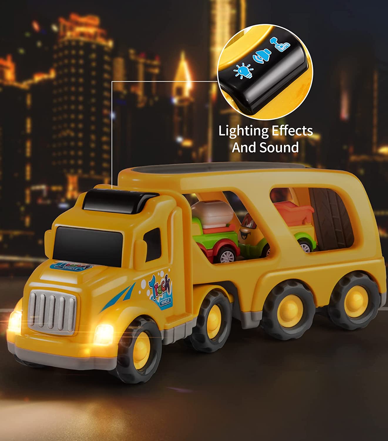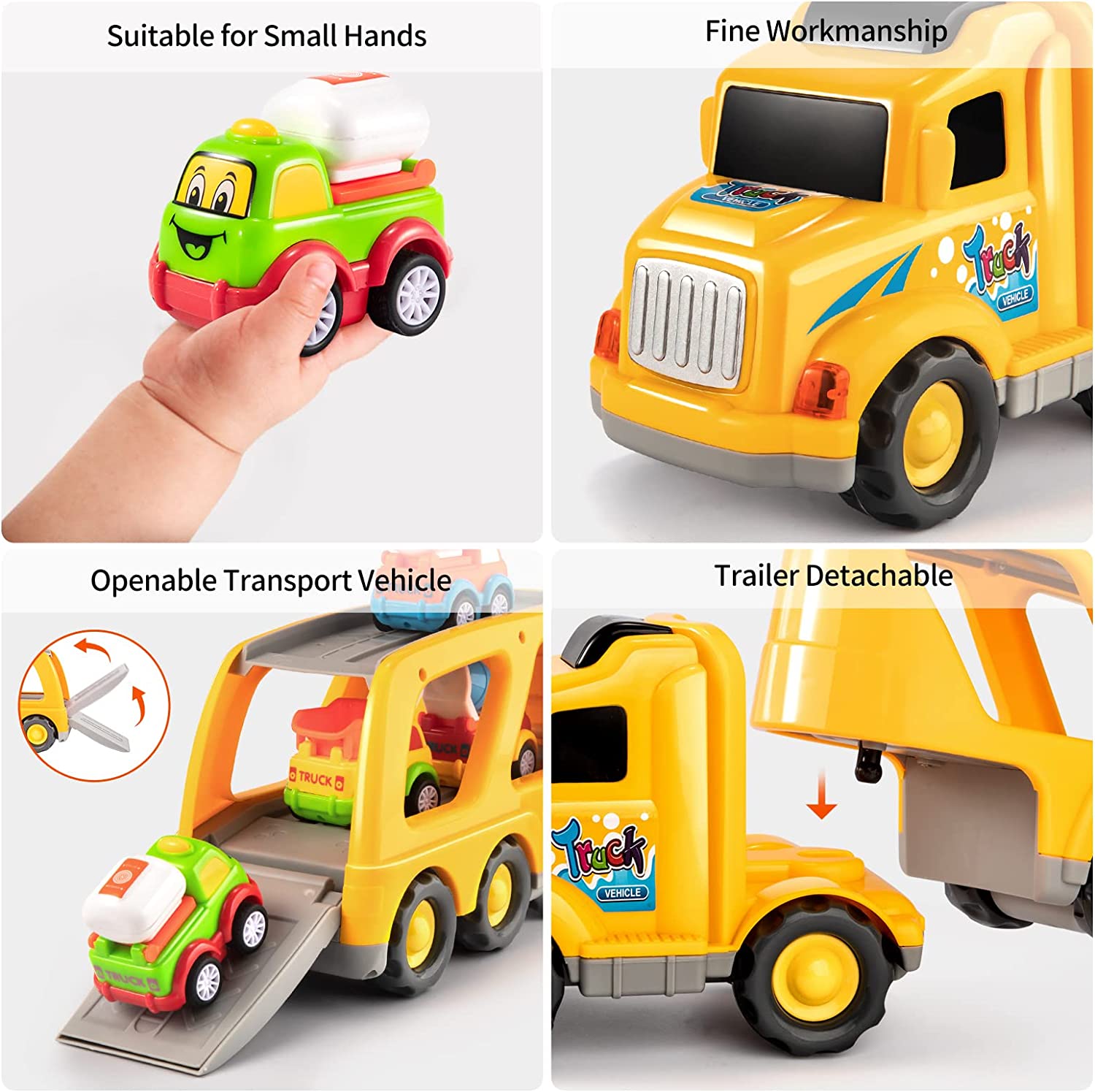 - Friction & Turnable & Removable: Just push and let it go,the hauler truck will carry four small engineering vehicles and set off! The head of the big carrier can also turn. After reaching, separate the cab and the traction compartment, and then open the tailgate to transport vehicles down. Pull the small vehicle back, the force of return allows them drive fast to start a construction job! Easy to play toys for baby.