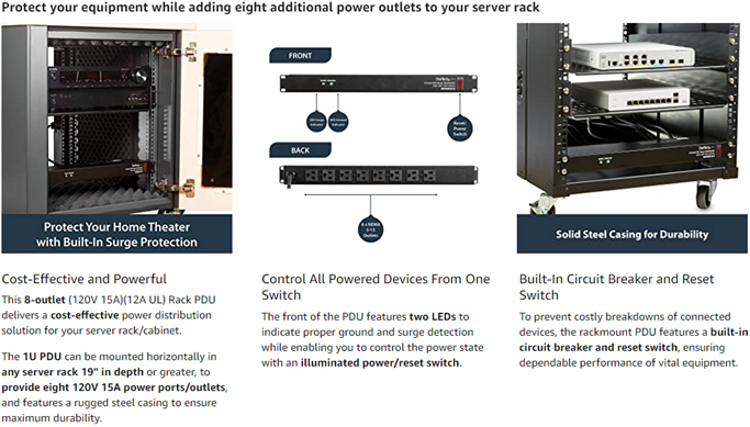 The Horizontal Rack Mount PDU delivers a cost-effective power distribution solution for your server rack or cabinet with 8-outlet (120V/15A). Hassle-Free Equipment Installation the 1U switched PDU strip can be mounted horizontally in any server rack 4 inches deep or greater, to supply eight 120V/15A power ports/outlets, and features a rugged steel casing to ensure maximum durability. Protects your equipment the front of the surge protector features two LEDs to indicate proper ground and surge detection while enabling you to control the power state with an illuminated power/reset switch. To prevent costly breakdowns of connected devices, the rack mount PDU features a built-in circuit breaker and reset switch, ensuring dependable performance of vital data center equipment. This unit is backed by a lifetime warranty with free technical support.
