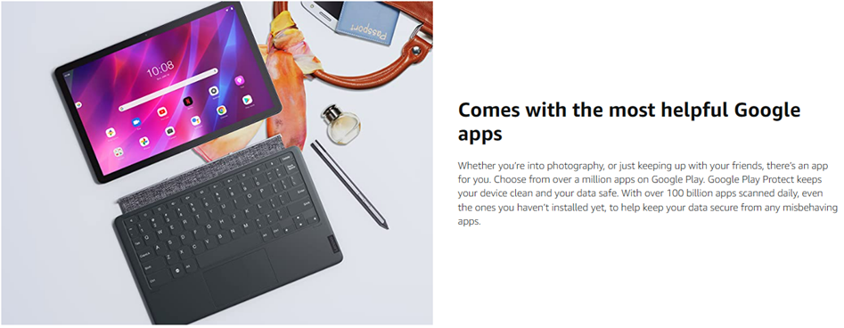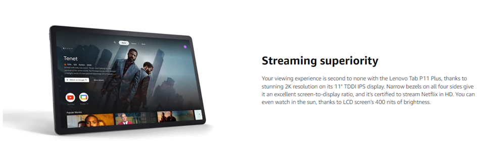 Experience first-class multimedia and fun with the Lenovo Tab P11 Plus. This Android tablet features a large, 11-inch screen with 2K resolution. You'll enjoy beautiful video in the IPS LCD touch display and great audio through quad speakers with user-facing stereo tuned by Dolby Atmos®. Inside, you'll find a powerful octa-core chip, 4GB + 128GB memory. Plus, this slim and lightweight tablet delivers epic battery life in an aluminum-alloy design with a dual-tone finish available in an elegant slate grey color.Running the Android™ 11 operating system, the Tab P11 Plus tablet offers Bluetooth® and Wi-Fi wireless connectivity and a USB Type-C™ 2.0 port for data transfer and charging. You can also use the USB-C port to attach a compatible headset. Use the front or rear camera to take photos or enjoy a family video chat – this Android tablet comes with a dual microphone array and quad speakers so you'll experience crisp, clear video and sound. You can even log in quickly and easily with Face Unlock.