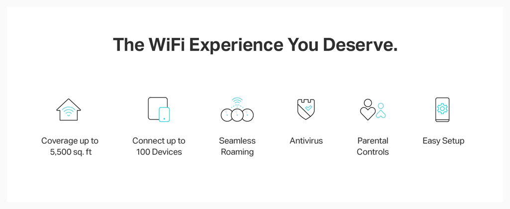 Maximum wireless transmission rates are the physical rates derived from IEEE Standard 802.11 specifications. Range and coverage specifications along with the number of connected devices were defined according to test results under normal usage conditions. Actual wireless transmission rate, wireless coverage, and number of connected devices are not, and will vary as a result of 1) environmental factors, including building materials, physical objects and obstacles, 2) network conditions, including local interference, volume and density of traffic, product location, network complexity, and network overhead and 3) client limitations, including rated performance, location, connection quality, and client condition. MU-MIMO capability requires both the mesh system and client devices to support MU-MIMO. Free lifetime subscription to TP-Link HomeCare is included with purchase on select TP-Link models at no additional cost. “Lifetime Subscription” refers solely to the life of the purchased device and cannot be transferred. TP-Link reserves the right to modify the service and feature at anytime.
