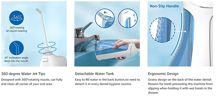 - PORTABLE DESIGN FOR TRAVEL: This water teeth cleaner picks with 5 replacement jet tips for multiple family members that can rotate 360 degrees during use, to fulfilled your variety needs from standard clean to gum massage, suitable home, office, business trips or traveling use on the go