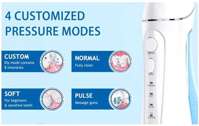 - 4 FLOSSING MODES POWER DENTAL FLOSSERS: Oralfree launch the newest portable water dental pick teeth cleaner items that was upgrade to 4 modes with Low-noise Design setting of water pressure to fulfilled your daily life use.Each mode provides you variety of using choice from standard mode, Please choose soft mode when you use dental flosser at the first time. Also helpful for bad breath, benefitful for bridge care
