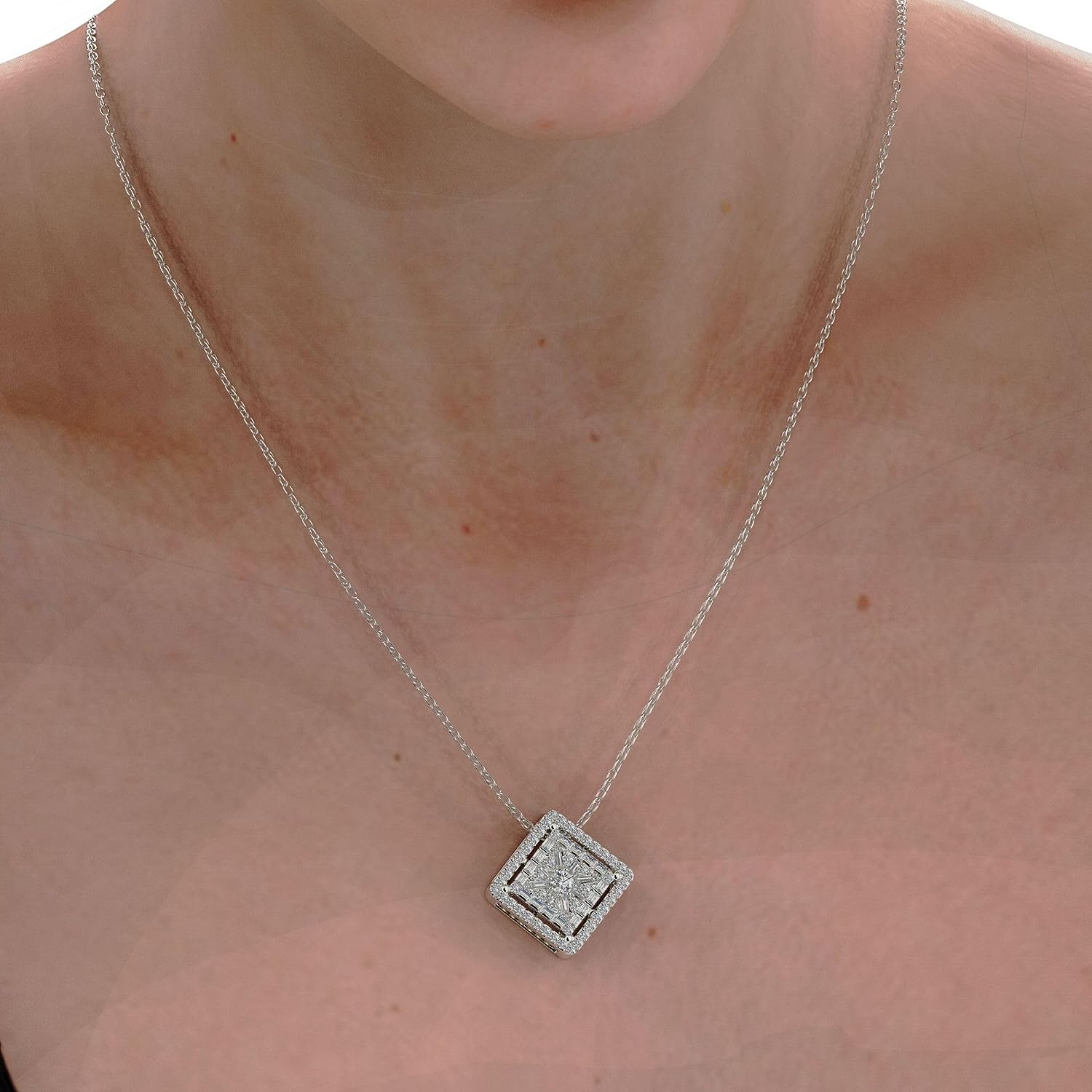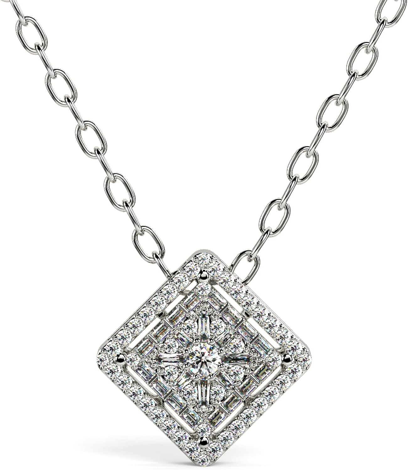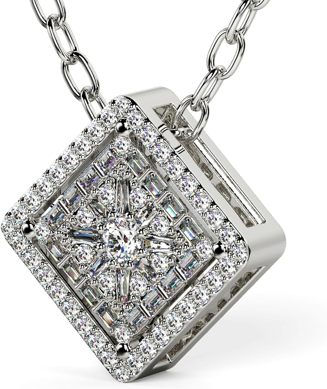 14K White Gold Diamond Pendant Necklace, 0.60 TCW Pave Setting Natural Elegant (SI2-I1, F, Very Good Cut) Round & Baguette Cut Diamonds, Width 5 mm, Height 12.10mm, Length 12.10mm, Jewelry For Women
