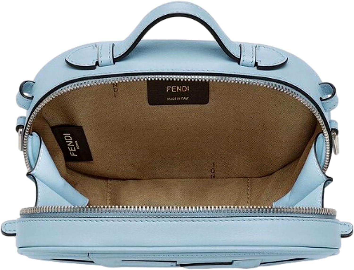 Baby Blue Calfskin Leather. FF Motif. Silver-Tone Hardware. Zipper Closure. Beige Canvas Interior Lining. 1 External Back Pocket.
